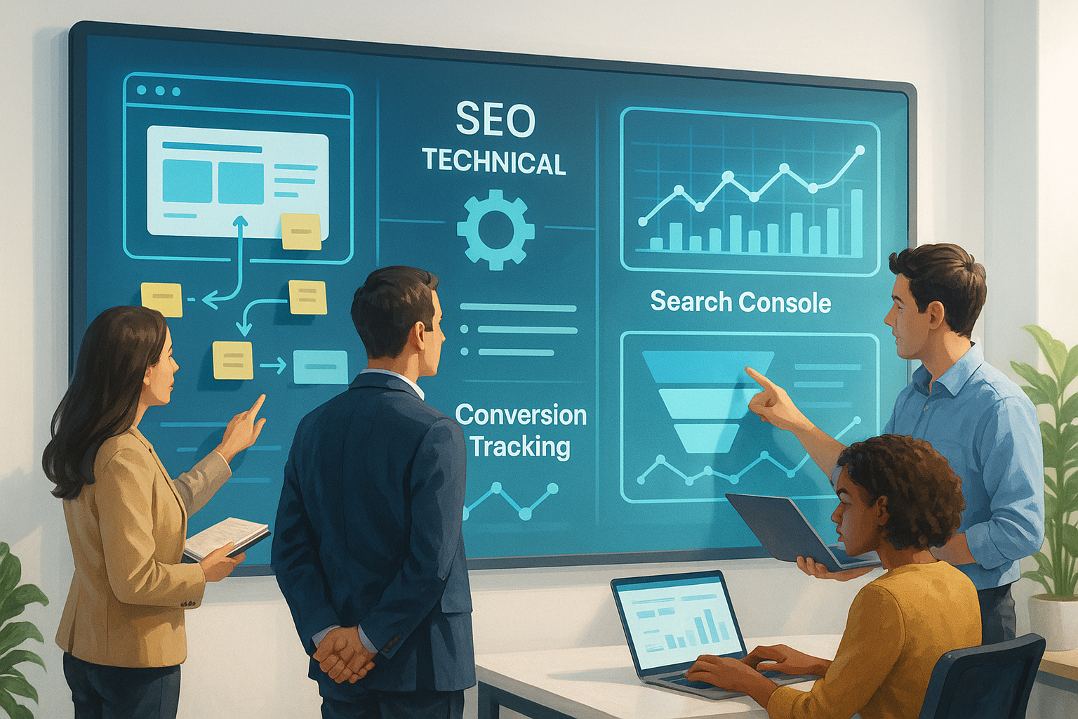 Nejdřív si ověřte technický základ. Zkontrolujte indexaci klíčových stránek, title a meta description, interní odkazy, Core Web Vitals, formuláře, CTA a propojení Search Console s GA4. Výstupem má být seznam priorit, ne padesát nepodstatných poznámek.